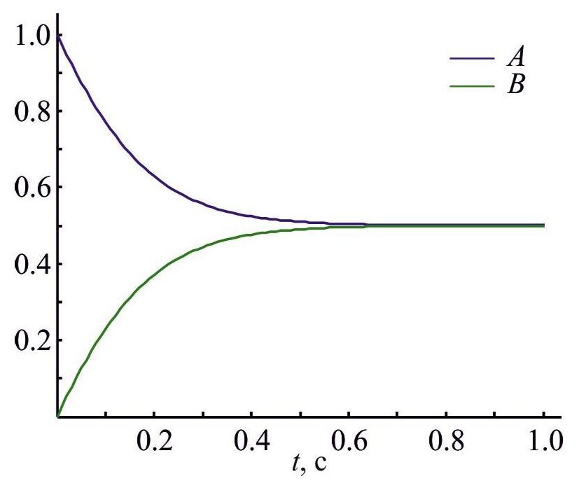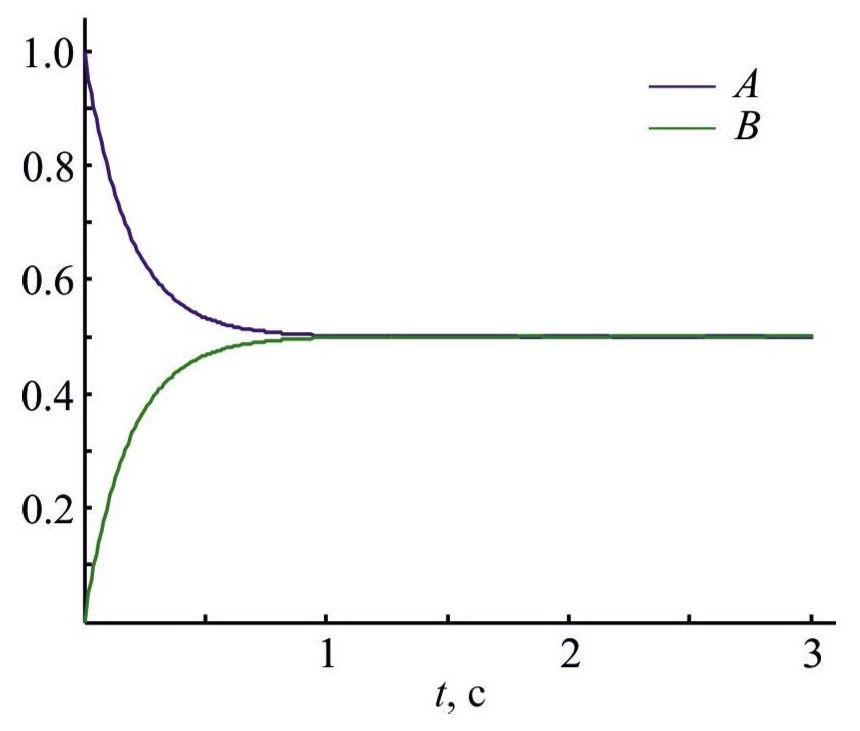 Динамика изменения концентраций реагентов реакции (1) для кинетики ЗДМ при k+ = k– = 1 и ε = 0.002 показана на рис. 1.