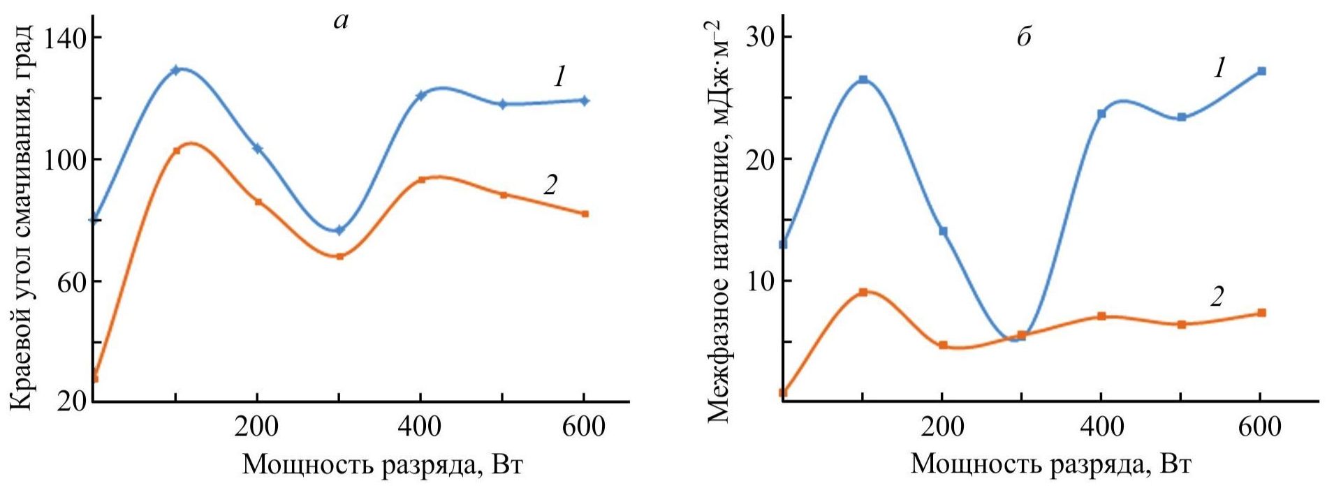 Рис. 1. Влияние мощности воздействия низкотемпературной плазмы на значения краевого угла смачивания (а), межфазного натяжения (б) в системе углеродное микроволокно, аппретированное фенолоформальдегидной смолой СФ-012А марки МУМВ-В/этиленпропилендиеновый каучук СКЭПТ-40 (1), углеродное микроволокно, аппретированное фенолоформальдегидной смолой СФ-012А марки МУМВ-В/бутадиен-нитрильный каучук БНКС-40 АМН (2).