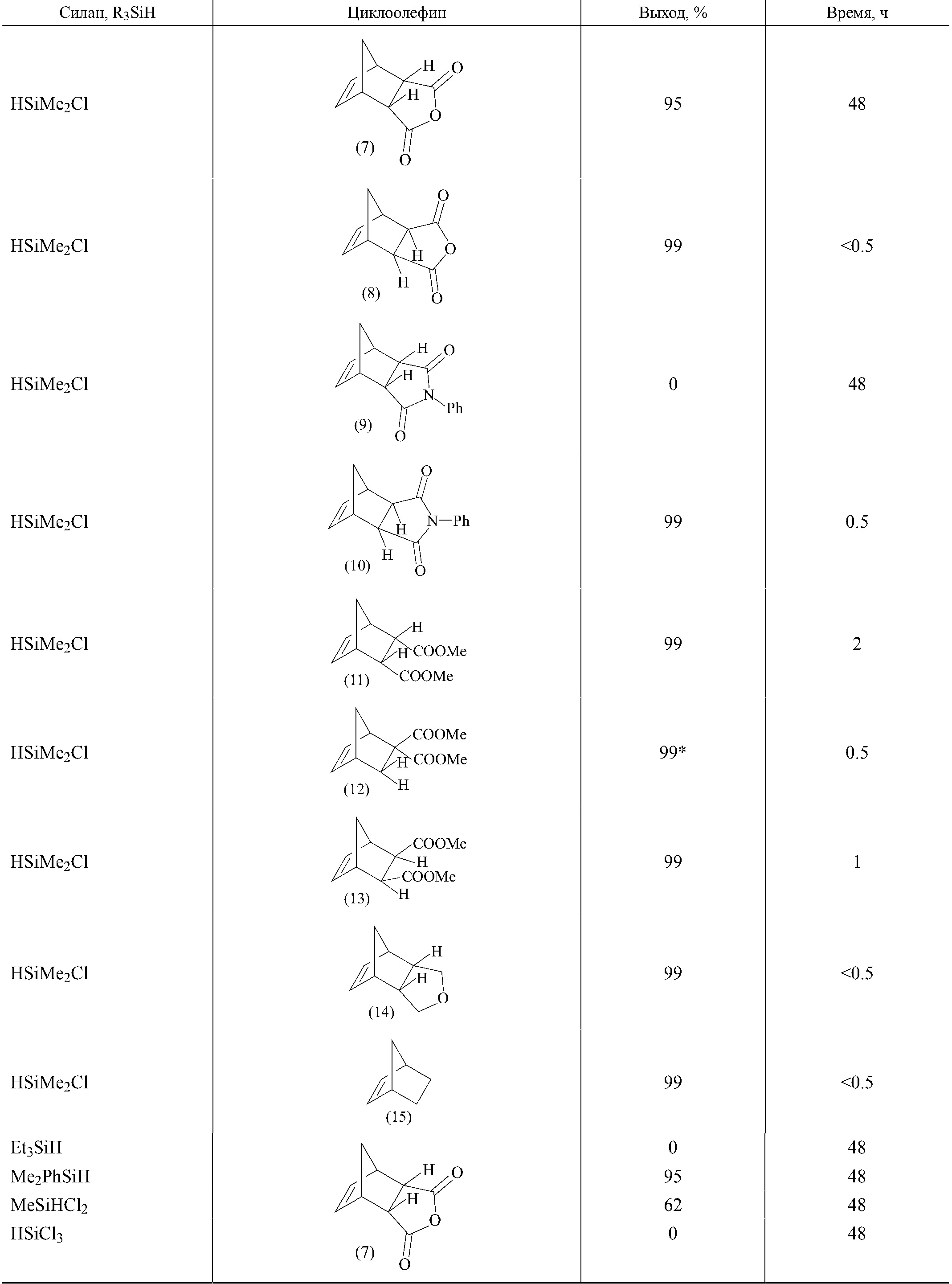 Таблица 2. Гидросилилирование замещенных бицикло[2.2.1]гепт-5-енов под действием силанов