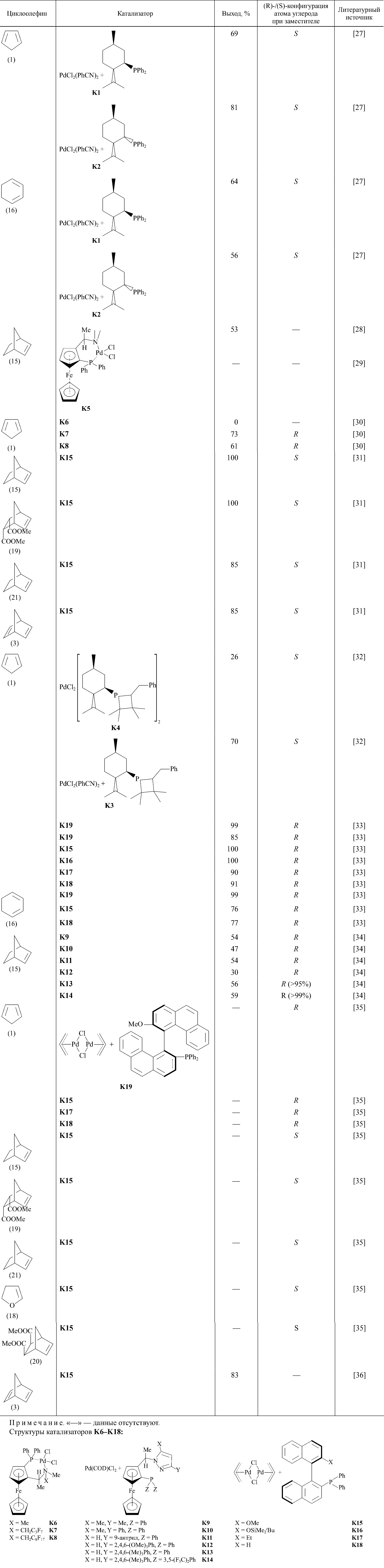 Катализаторы на основе Pd в реакции гидросилилирования ненасыщенных углеводородов, в том числе и циклоолефинов, могут проявлять высокую как регио- и стерео-, так и энантиоселективность в этой реакции. Гидросилилирование циклоолефинов так же, как и гидросилилирование линейных моно- и 1,2-дизамещенных диенов, может сопровождаться образованием хирального центра, поэтому продукты этой реакции могут использоваться в качестве прекурсоров хиральных спиртов, которые впоследствии также можно использовать для асимметрического синтеза. Триметилсилильная группа может быть превращена в гидроксильную путем окисления в присутствии KF, при этом конфигурация хирального центра сохраняется [23, 24]. Кроме того, стереоселективное гидросилилирование напряженных циклических диенов (например, норборнадиена-2,5) может давать именно те стереоизомеры кремнийзамещенных олефинов, которые активны в полимеризации [12, 25, 26].