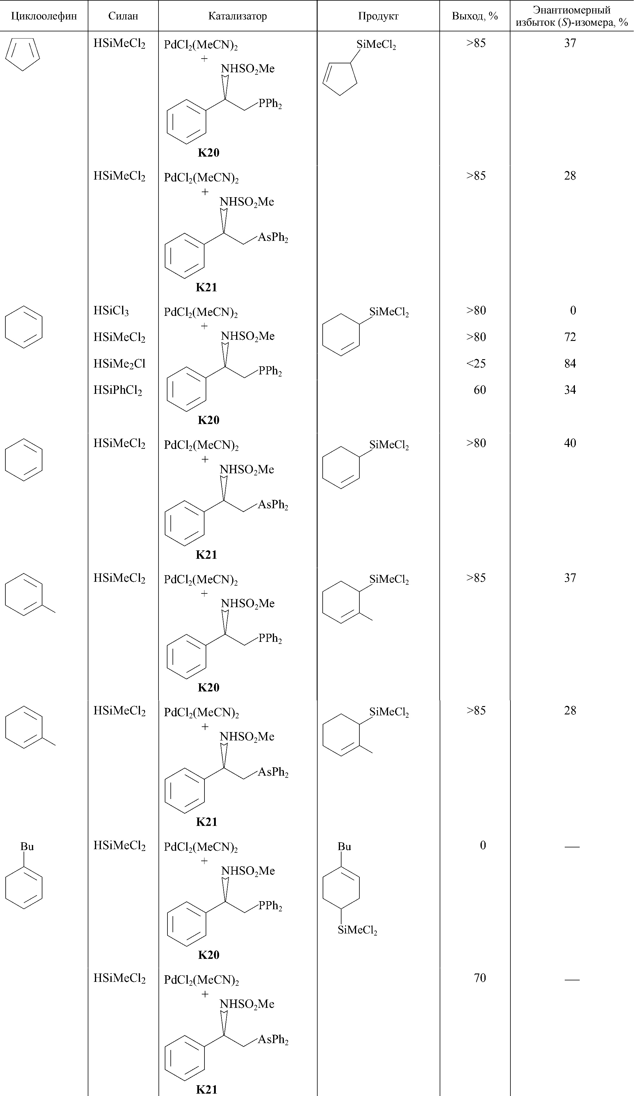В литературе также описаны реакции гидросилилирования циклоолефинов в присутствии Pd-катализатора и с другими галогенсодержащими силанами, такими как HSiMe2Cl, HSiMeCl2, HSiPhCl2, HSiPhF2. В работе [38] было показано, что в гидросилилировании циклических диенов в присутствии Pd-катализаторов с хиральным P,N-лигандом (K20, K21) HSiMeCl2 не менее активен, чем HSiCl3, за исключением реакции с наиболее объемным 1-бутилциклогексадиеном-1,3 (табл. 4), однако HSiMe2Cl существенно менее активен: реакция с ним дает продукт с существенно меньшим выходом. При этом замена метильной группы в силане на фенильную способствует повышению активности. Энантиомерная чистота продукта также зависит от природы гидросилана: при реакции с HSiCl3 образуется рацемическая смесь, а при реакции с силанами, содержащими меньшее число атомов хлора, — преимущественно (S)-изомеры продуктов. Наибольший энантиомерный избыток (84%) был достигнут в случае наименее активного силана: HSiMe2Cl. Природа катализатора также оказывала влияние на энантиомерную чистоту продукта: при использовании более активного катализатора, содержащего арсиновый фрагмент, энантиомерный избыток продукта был ниже по сравнению с катализатором с фосфиновым фрагментом (табл. 4).