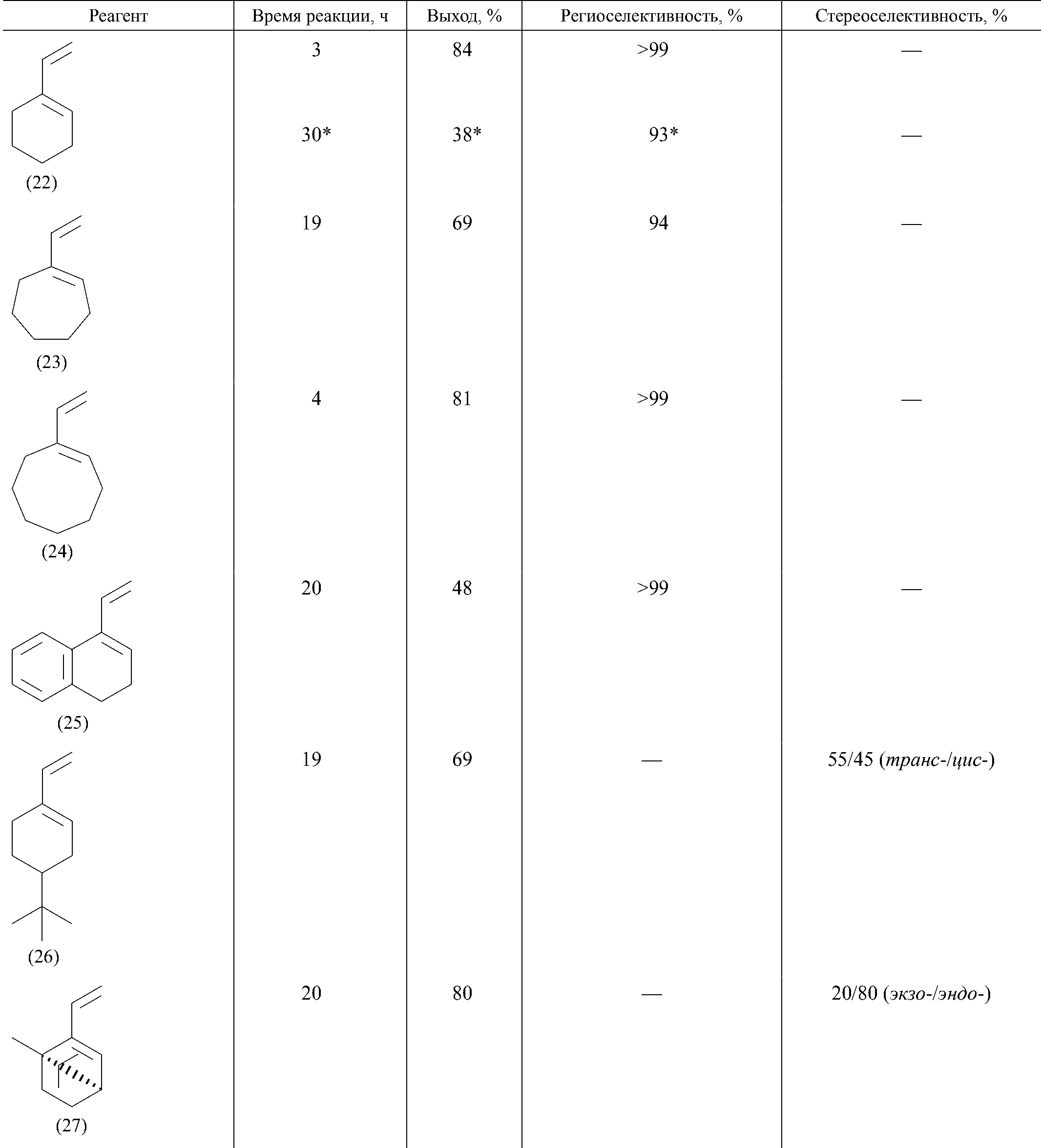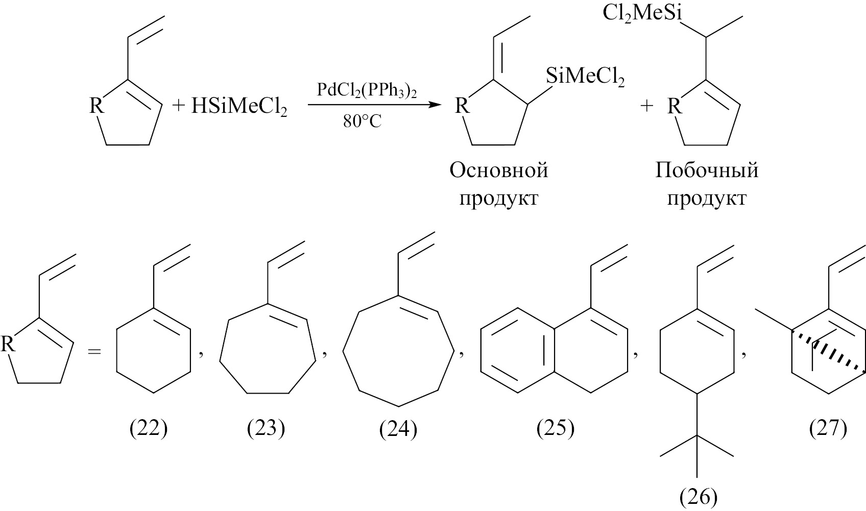 Еще одной характеристикой гидросилилирования циклоолефинов, определяющей возможность его применения для синтеза, является региоселективность. Авторы работы [40] показали, что гидросилилирование различных 1-винилциклоалкенов метилдихлорсиланом в присутствии Pd-катализатора [PdCl2(PPh3)2, K22] осуществляется региоселективно: в этом процессе атом кремния присоединяется преимущественно к эндоциклической двойной связи (X), а не к винильной группе. Двойная связь при этом в процессе реакции изомеризуется, в результате чего продукт содержит этилиденовый заместитель в отличие от реагента с винильным заместителем. Во всех случаях доля основного продукта превышала 90% (табл. 5). Кроме того, в случае субстратов с объемным трет -бутильным заместителем [(26), (X)] и мостиковым фрагментом [(27), (X)] реакция также протекала стереоселективно, с преимущественным образованием продукта, в котором эти структурные фрагменты ориентированы относительно кремнийсодержащего заместителя в противоположные стороны.