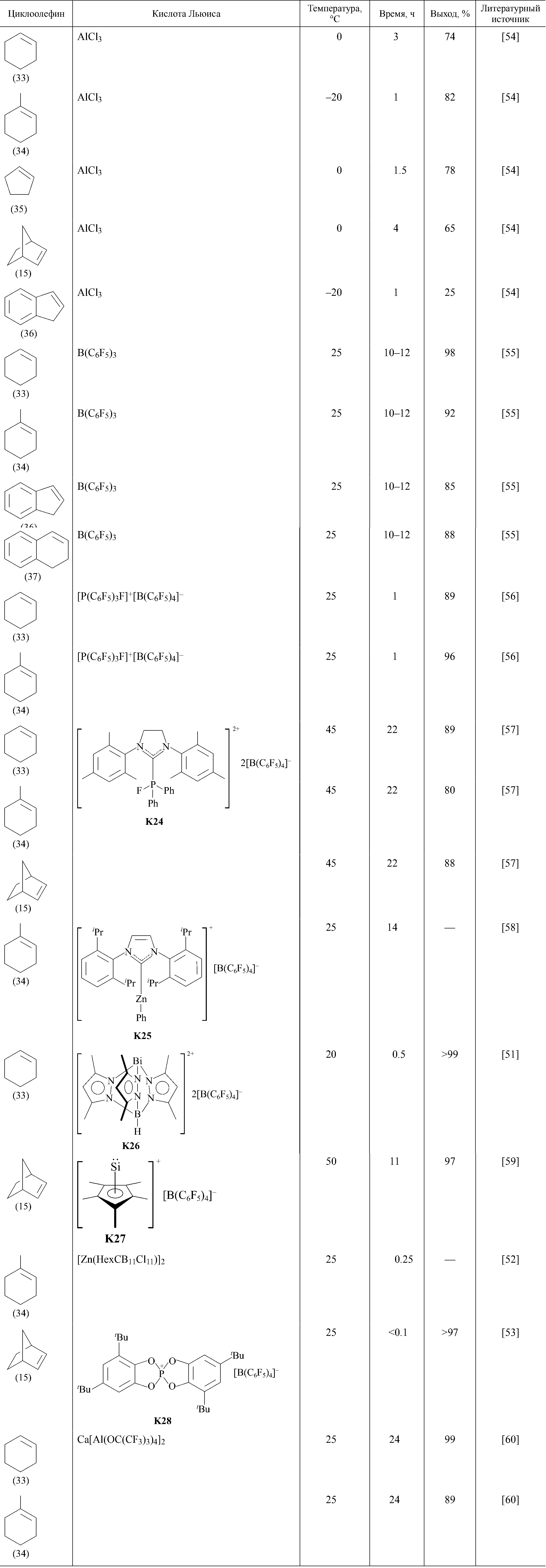 K1–K28 — катализаторы, используемые для гидросилилирования циклоолефинов: