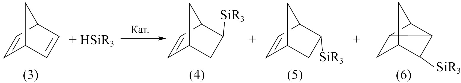 Гидросилилирование норборнадиена-2,5 гидросилоксанами HSiMe2 OSiMe3 и HSiMe(OSiMe3)2 в присутствии (acac)Rh(CO)2 (0.05 мол. %, 25°C, 48 ч) приводит к смеси экзо- и эндо-норборненов и нортрициклана [(4)–(6); (II)], однако соотношение продуктов значительно меняется [применение катализатора на основе Rh дает образование 19–20% нортрициклана (6) по сравнению с платиновым катализатором, под действием которого образуется 1–8% нортрициклана] [12]. Преобладающим продуктом остается эндо-изомер силилированного норборнена (5).