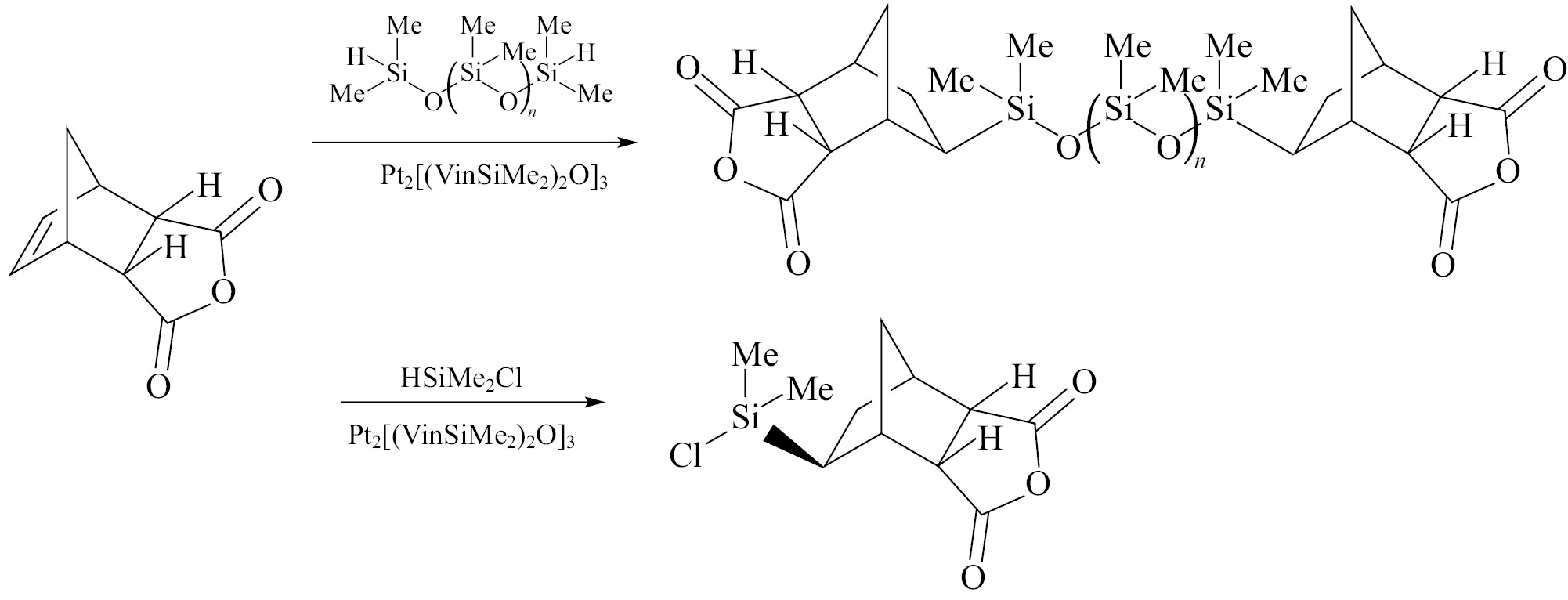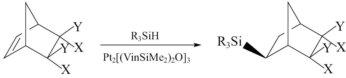 В работе [15] исследовали гидросилилирование ангидрида эндо-бицикло[2.2.1]гепт-5-ен-2,3-дикарбоновой кислоты под действием α,ω-бис(гидросилил)олигосилоксанов в присутствии катализатора Карстедта (III); полная конверсия достигается при повышенной температуре (100°С, толуол). Использование диметилхлорсилана HSiMe2Cl в этой реакции приводит к экзо-изомеру.