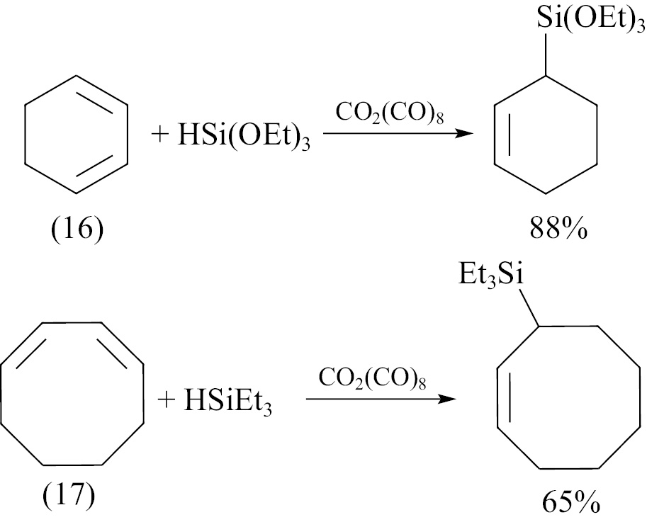 Комплексы металлов 9 группы также зачастую используют как катализаторы гидросилилирования циклоолефинов. Так, для осуществления гидросилилирования циклогексадиена-1,3 (16) и циклооктадиена-1,3 (17) моногидросиланами [HSi(OEt)3 и HSiEt3] был использован октакарбонилдикобальт [Сo2(CO)8] [18, 19] (V). Оба процесса проводили при 20°С в течение 12 ч. Выходы реакций составили 88 и 65%.