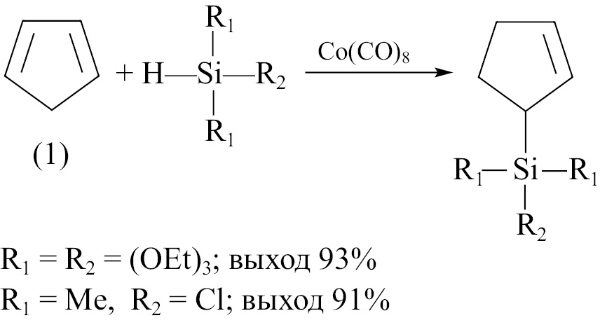 Гидросилилирование циклопентадиена (1) с участием HSi(OEt)3 или HSiMe2Cl в присутствии Co2(CO)8 [или Rh4(CO)12] протекает в мягких условиях, селективно и завершается за 1 ч [20] (VI). Соотношение компонентов реакции циклопетадиен/силан/Co2(CO)8 [или Rh4(CO)12] составляло 150:150:1.