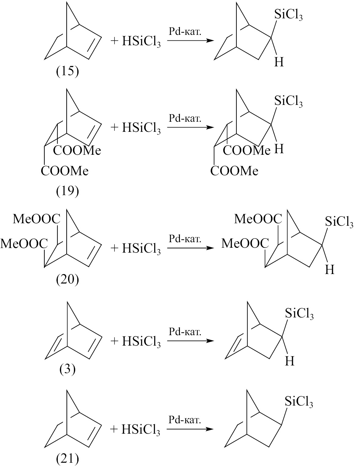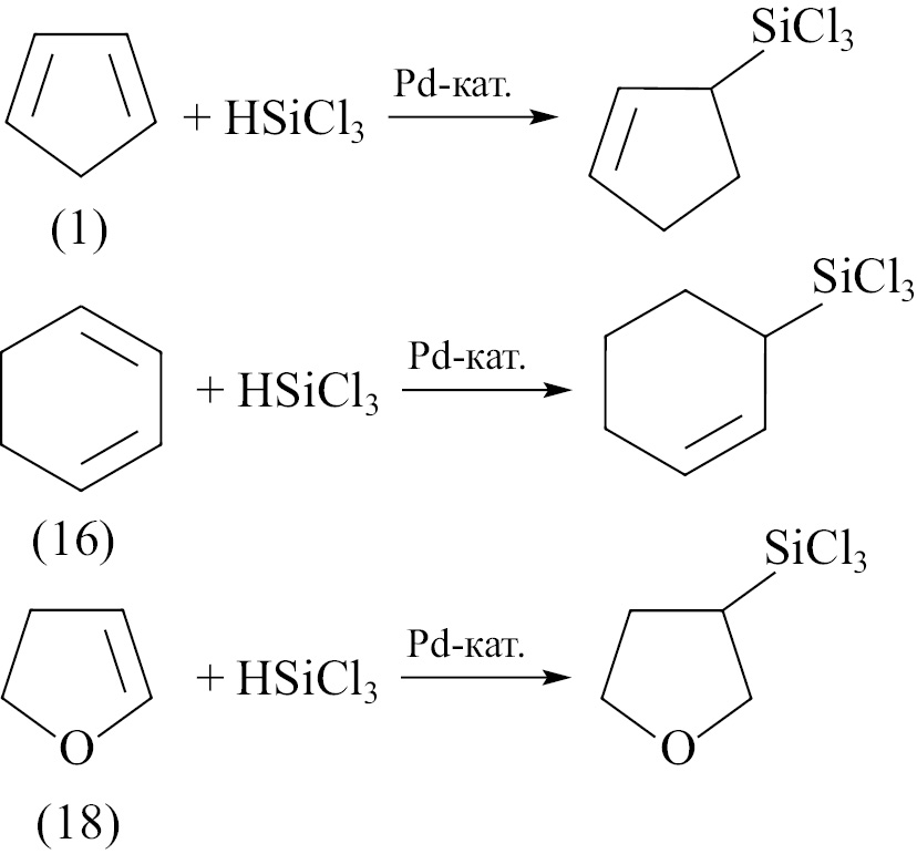 В литературе встречается несколько примеров гидросилилирования циклоолефинов на Pt-катализаторе. Например, при гидросилилировании циклопентадиена (1) трихлорсиланом в присутствии катализатора Спайера (H2PtCl6) (I) образуется сложная смесь изомеров, причем основным продуктом является моносилилированный [2+1]-димер (40%) — продукт присоединения трихлорсилана к дициклопентадиену (2) [10].