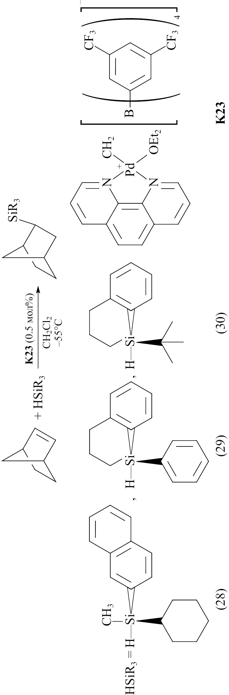Стерео- и энантиоселективное гидросилилирование циклоолефинов неактивированными (не содержащими хлор) гидросиланами может значительно расширить возможности применения этой реакции и позволит использовать ее для синтеза кремнийорганических соединений непосредственно из силанов, минуя стадию алкилирования связи Si—Cl. В работе [41] такой процесс был успешно осуществлен с использованием циклических хиральных гидросиланов: реакция гидросилилирования этих силанов с норборненом протекает как стерео-, так и энантиоселективно (XI). В качестве катализатора в этой реакции был использован катализатор Брукхарта (K23) — катионный комплекс палладия со слабокоординирующим боратным противоионом. В результате реакции образовывались экзо- и эндо-изомеры продуктов в соотношении 99:1. Выходы продуктов гидросилилирования силанами (29) и (30) составили 20 и 58% соответственно. В обоих случаях наблюдается высокий энантиомерный избыток продукта (более 92%). Следует отметить, что силан (28) оказался малоактивным в реакции. Интересной особенностью данной реакции оказалось то, что при гидросилилировании норборнена силаном (30) энантиомерный избыток продукта (93%) превышал энантиомерный избыток реагента — силана (85%). Эта же особенность сохранялась при гидросилилировании и норборнадиена-2,5 по двум двойным связям (двойная асимметричная индукция),1 но отсутствовала при гидросилилировании 5,6-бензонорборнена (в этом случае как у реагента, так и у продукта энантиомерный избыток составляет 65%) [41].