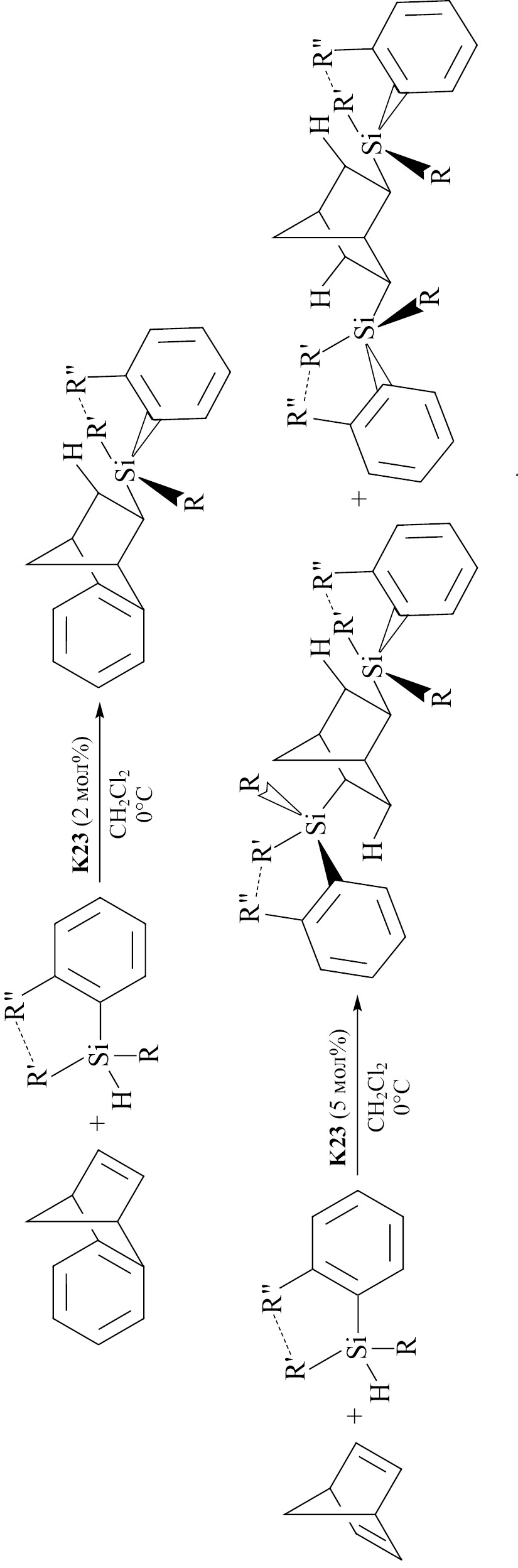 Аналогично в работе [42] было изучено гидросилилирование 5,6-бензонорборнена хиральными циклическими гидросиланами с различным размером цикла, а также метил-трет-бутил-фенилсиланом (XII) в присутствии того же катализатора [K23, (XI)]. Выходы реакций составляли 70–95%, причем наибольшие — в случае силанов с шестичленными циклами. Во всех случаях реакций с энантиомерно чистыми гидросиланами [как в виде (R)-, так и в виде (S)-изомеров] наблюдалась высокая степень переноса хиральности от атома кремния к атому углерода. При этом реакции были более чем на 90% стереоселективны и характеризовались преимущественным образованием экзо-изомера. Аналогичным образом были изучены реакции гидросилилирования норборнадиена-2,5 этими же силанами по двум двойным связям. В этом случае также наблюдалась высокая степень переноса хиральности и присоединение силана только в положения 2 и 5 [(31), (XII)] при использовании реагентов в виде чистых энантиомеров. Образование продукта присоединения по положениям 2 и 6 [(32), (XII)] наблюдалось только в случае, когда исходный силан представлял собой рацемическую смесь.