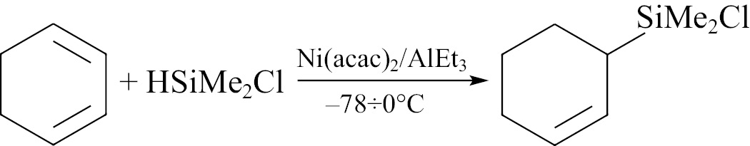 Известны примеры гидросилилирования циклоолефинов с использованием Ni-катализаторов. Например, в работе [46] циклогексадиен-1,3 гидросилилировали диметилхлорсиланом в присутствии ацетилацетоната никеля, активированного триэтилалюминием (XIII). Для применения этого катализатора не требуется высоких температур в отличие от палладиевых катализаторов, примененных в этой работе. Продукт был получен с выходом 72%.