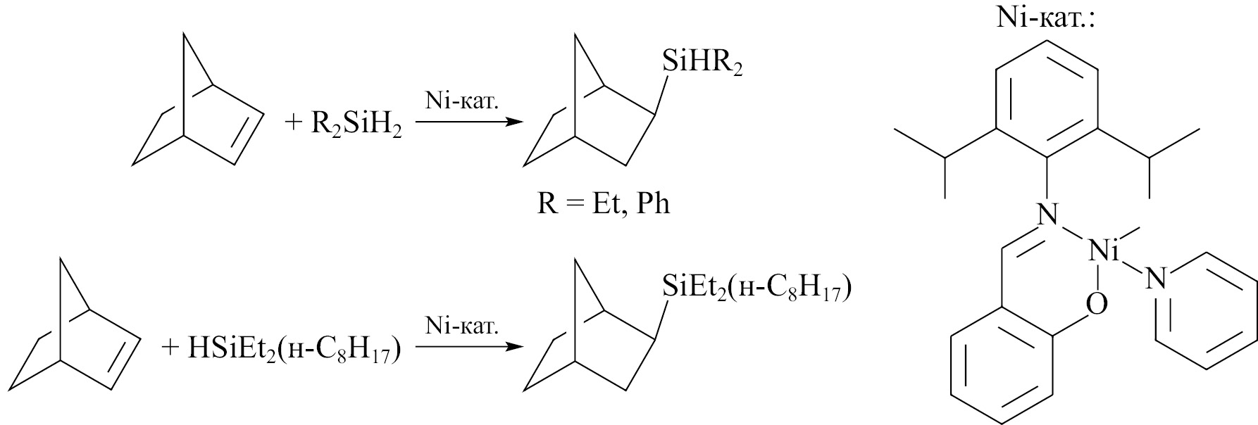 Авторами [47] была разработана серия высокоэффективных и селективных катализаторов гидросилилирования олефинов неактивированными гидросиланами на основе никеля, один из которых был опробован в реакции гидросилилирования норборнена моно- и дигидросиланами (XIV). Этот катализатор оказался достаточно активным и экзо-стереоселективным. Реакция в его присутствии может быть проведена при комнатной температуре, а селективность образования экзо-изомера превышает 90%.