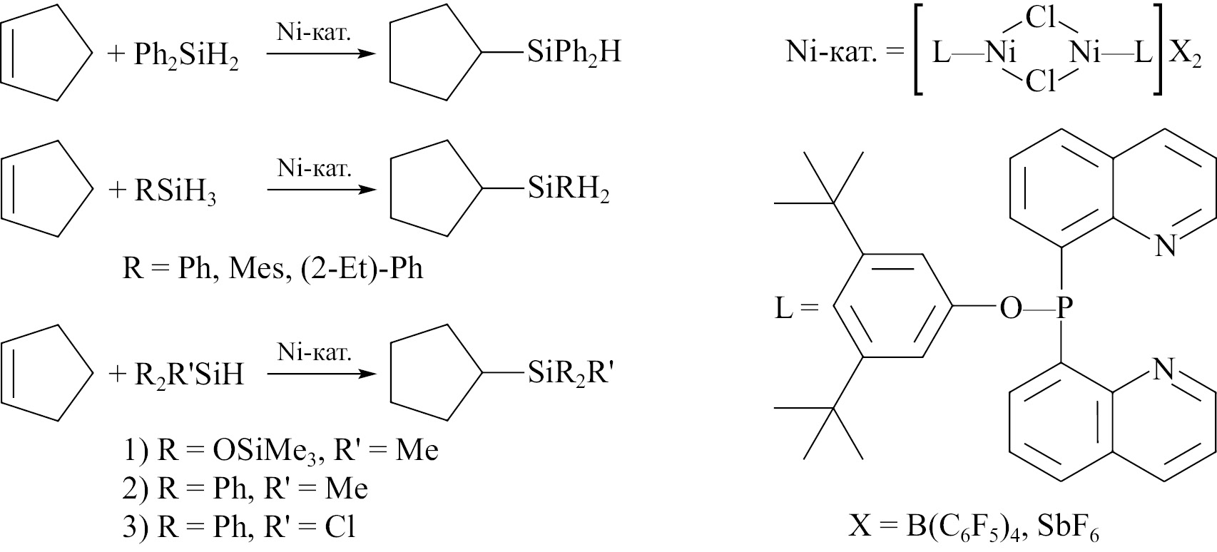 Еще один катализатор, эффективный для гидросилилирования циклоолефинов (XV) моно-, ди- и тригидросиланами, описан в работе [48]. Представлено много примеров использования его для получения различных силанов с циклопентильными заместителями. Все реакции протекают с высокими выходами (до 98%).