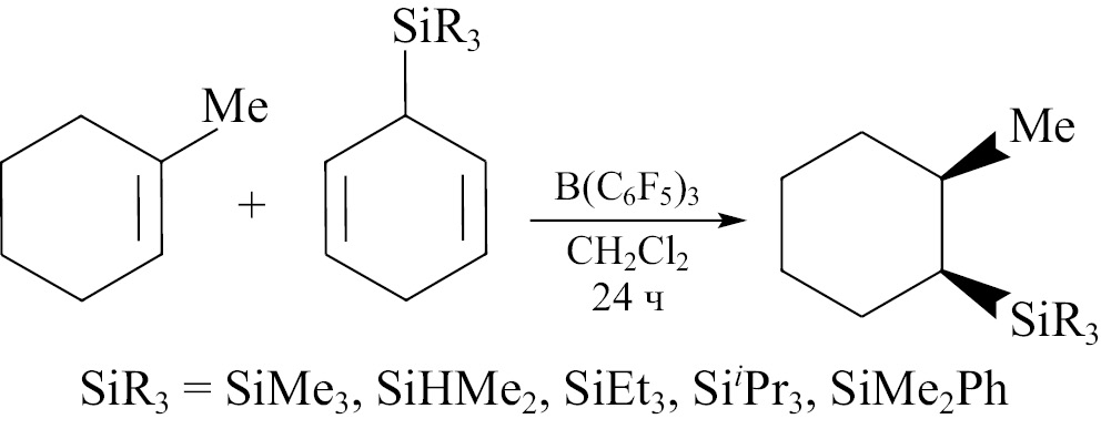 Один из способов гидросилилирования циклоолефинов — непрямое гидросилилирование. Этот процесс основан на использовании реакции циклоолефина с аддуктом гидросилана с бензолом — 3-силилгексадиеном-1,4, а не непосредственно с гидросиланом в присутствии кислоты Льюиса. Авторы работы [61] таким образом осуществили гидросилилирование серии циклоолефинов, что позволило им получить ряд циклоалканов, в том числе и SiMe3 -замещенных (XIX). В качестве кислоты Льюиса был использован B(C6F5)3 . Аддукт триалкилсилана с бензолом в свою очередь был получен по реакции соответствующего гидросилана с бензолом в присутствии той же кислоты Льюиса. В работе были оптимизированы условия реакции и найдено, что оптимальным растворителем является дихлорметан: выходы продуктов в этом случае достигали 95%. Разработанная методика гидросилилирования была использована для синтеза различных триметилсилилзамещенных цикло- и бициклоалканов, в том числе индана, метилиндана, циклооктана, норборнана. В случае норборнана с высокой селективностью (95%) образовывался экзо-изомер.
