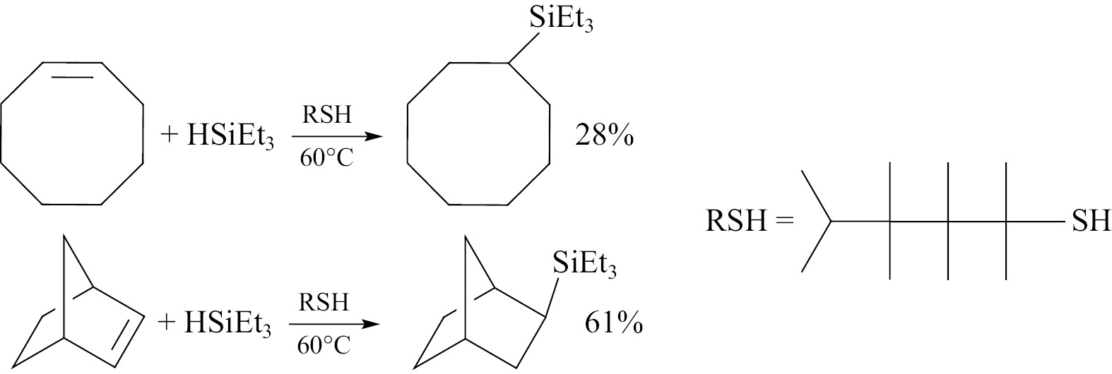Реакция гидросилилирования олефинов также может протекать по радикальному механизму [7], в том числе в присутствии комплексов переходных металлов (чаще всего — карбонилов) [62]. При этом ключевой стадией является присоединение радикала SiR3, образующегося из гидросилана, по двойной связи. Такие процессы могут происходить под действием радикальных инициаторов, ультрафиолетового облучения либо при нагревании. Преимуществом радикального гидросилилирования перед каталитическим является возможность получать кремнийуглеводороды непосредственно из неактивированных гидросиланов (например, триэтилсилана). Однако, как правило, такие процессы не протекают стерео- и региоселективно. В литературе описано несколько примеров гидросилилирования циклоолефинов по радикальному механизму. Большая часть таких работ посвящена фото- и термически катализируемому гидросилилированию с использованием катализаторов переноса атома водорода. Так, в работе [63] нагревание циклооктена и норборнена с триэтилсиланом до 60°C в присутствии тиола в качестве катализатора переноса атома водорода дало продукты их гидросилилирования с относительно невысокими выходами (XX).