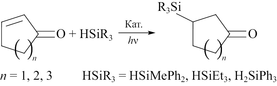Тем не менее и фотокатализируемое гидросилилирование циклоолефинов может быть региоселективным. В ряде недавних работ были изучены реакции гидросилилирования ненасыщенных циклических кетонов в присутствии фотокатализаторов переноса атома водорода (XXII). Так, авторы [66] использовали катализатор на основе комплекса вольфрама для гидросилилирования циклопентенона метилдифенилсиланом, в результате чего с выходом 40% был региоселективно получен 3-кремнийзамещенный циклопентан. В работе [67] изучали гидросилилирование цикопентенона, циклогексенона и циклогептенона триэтилсиланом в присутствии 1,3,4,5-тетракис[N-карбазолил]-2,6-дицианобензола — катализатора переноса атома водорода, не содержащего металлов. В результате также региоселективно были получены продукты присоединения кремния в положение 3 с выходами 33–74%. В работе [68] природный эозин использовали как фотокатализатор для гидросилилирования циклогексенона триэтилсиланом, и также региоселективно был получен продукт 3-присоединения с выходом 45%.