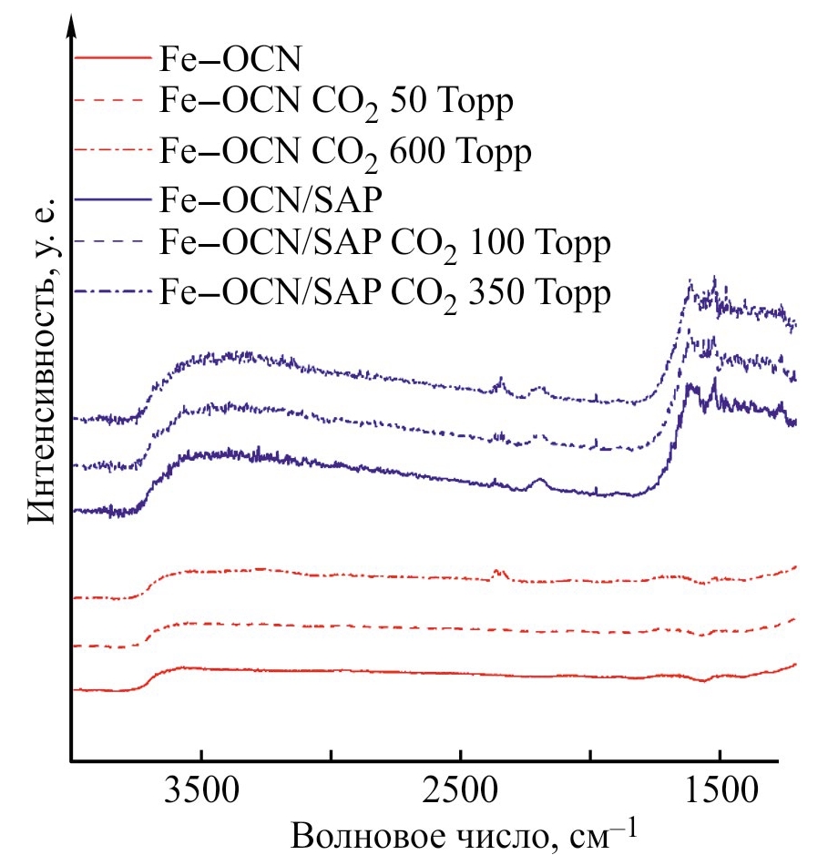 На всех кривых (рис. 6) зарегистрированы полосы поглощения в областях 3500–2500 см–1, характерные для колебаний связей —COOH, —OH или карбонатов. В спектрах катализатора Fe–OCN/SAP выявлены полосы в области 2200 см–1, которые относятся к связям С=С или С=N, полоса в области 2000 см–1 и полосы в области 1600–1000 см–1, соответствующие колебаниям различных связей С—С. При увеличении давления CO2 над поверхностью катализаторов увеличивается интенсивность и площадь пика при 2350 см–1, что может свидетельствовать о присутствии в катализаторах Fe–OCN и Fe–OCN/SAP активных частиц, способных адсорбировать CO2 и участвовать в его гидрировании [18].