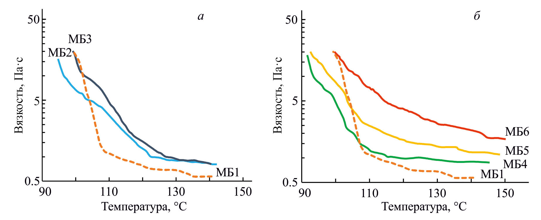 Рис. 3. Вязкостно-температурные зависимости (охлаждение) смесей модельных битумов (МБ) с вторичным линейным полиэтиленом низкой плотности.