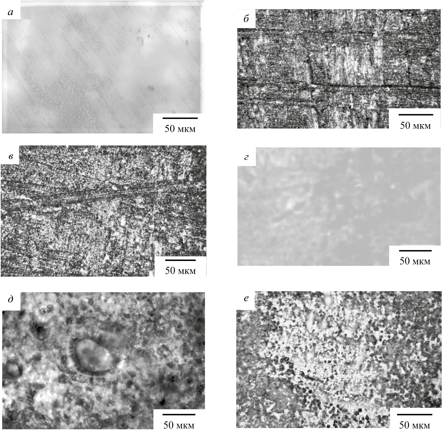 Рис. 1. Изображения поверхностей образцов стали (а–в) и сплава алюминия (г–е), контрольных образцов (а, г), при облучении в режиме № 1 стали (б) и сплава алюминия (д) и в режиме № 2 — стали (в), сплава алюминия (г).