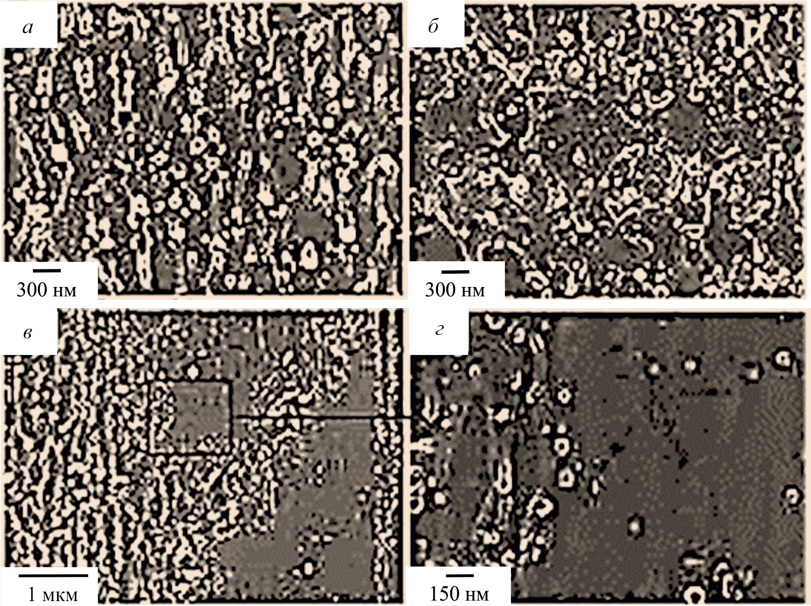 После воздействия импульсами фемтосекундного лазера в режиме № 2 поверхность стали, в частности, представляет собой одномерную квазипериодическую структуру (рис. 2, а), состоящую из выступов шириной 80–150 нм (период 200 нм) и отдельных наночастиц с формой, близкой к сферической, и размерами от 30 до 120 нм. Пороги откольной и фрагментарной обляции для аустенитных нержавеющих сталей составляют 0.29 и 0.55 Дж·см–2 соответственно [10]. Следовательно, можно предположить, что образование в нашем случае одномерной квазипериодической структуры происходит при плотности энергии ниже порога откольной обляции. Тем не менее на поверхности образца стали Ст08кп наблюдаются небольшие участки (рис. 2, б) со структурой, характерной для механизма откольной обляции, в виде хаотичных неупорядоченных образований, вероятно, в виде остатков отслоившейся после охлаждения пленки. После передачи энергии от электронной подсистемы к ионной и переноса тепла вглубь мишени происходит объемное плавление поверхностного слоя [7]. Плавление сопровождается акустическими явлениями: зарождением волн сжатия и разрежения, формированием ударной волны, возникновением мощных растягивающих напряжений. Действие последних вызывает кавитационное разрушение в расплаве с последующим отрывом и разлетом частиц жидкого слоя в виде откольной пластины (термомеханическая абляция). Вблизи края пограничной области лазерного воздействия (лазерного пятна) наблюдаются слабо выраженные образования периодической поверхостной наноструктуры (рис. 2, в), наноразмерные полости и кратеры с раскрывшейся вершиной (рис. 2, г). Все это может говорить о кавитационном механизме (гомогенное вскипание) образования указанных поверхностных дефектов [5].
