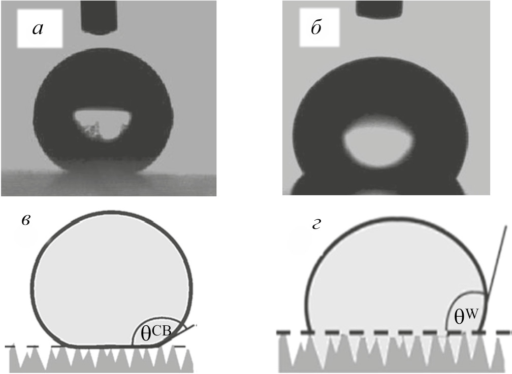 Рис. 5. Статический контактный угол смачивания водой в состоянии Венцеля (а, в) и Касси–Бакстера (б, г), соответственно, гомогенного и гетерогенного режимов смачивания.