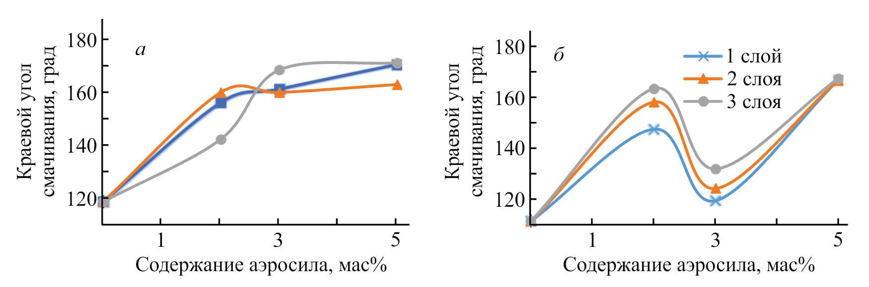 Рис. 6. 3ависимость краевого угла смачивания от содержания функционализированного аэросила в растворе фторированного лака и количества нанесенных слоев покрытия на подложках сплава алюминия АД1Н (а) и стали Ст08кп (б), подвергнутых облучению фемтосекундным лазером в режиме № 1 (энергия в импульсе 2 мкДж, пиковая плотность энергии в импульсе 0.25 Дж·см–2, число импульсов в точке N 1440 шт., плотность мощности в импульсе 0.45·1012 Вт·см–2).