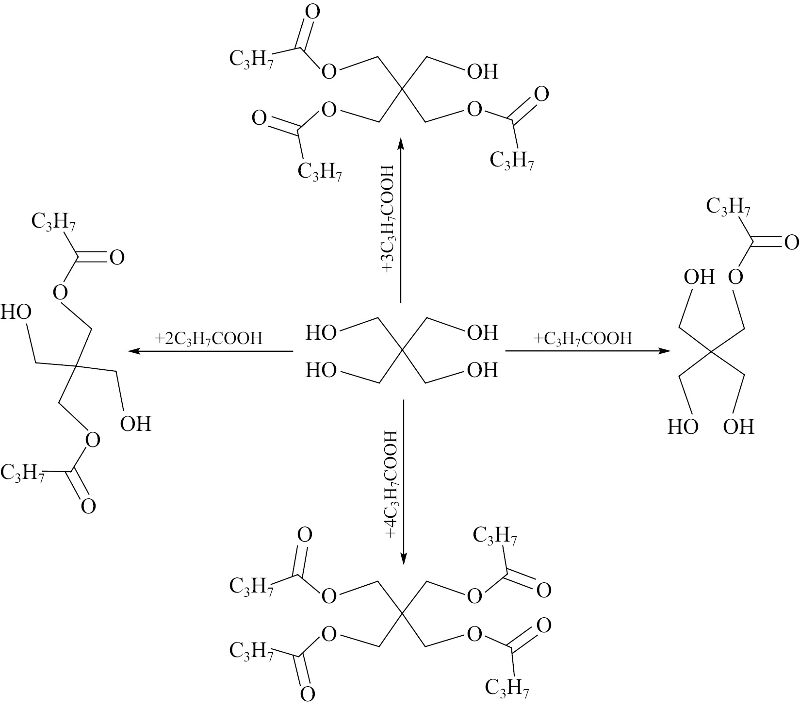 Этерификация масляной кислоты пентаэритритом проходит через последовательное образование моно-, ди- и трибутиратов пентаэритрита [11]. Порядок реакции принят равным 2 [уравнение (1)].