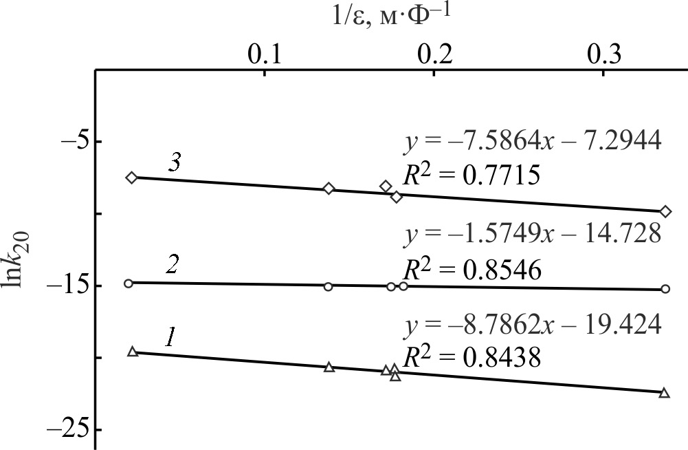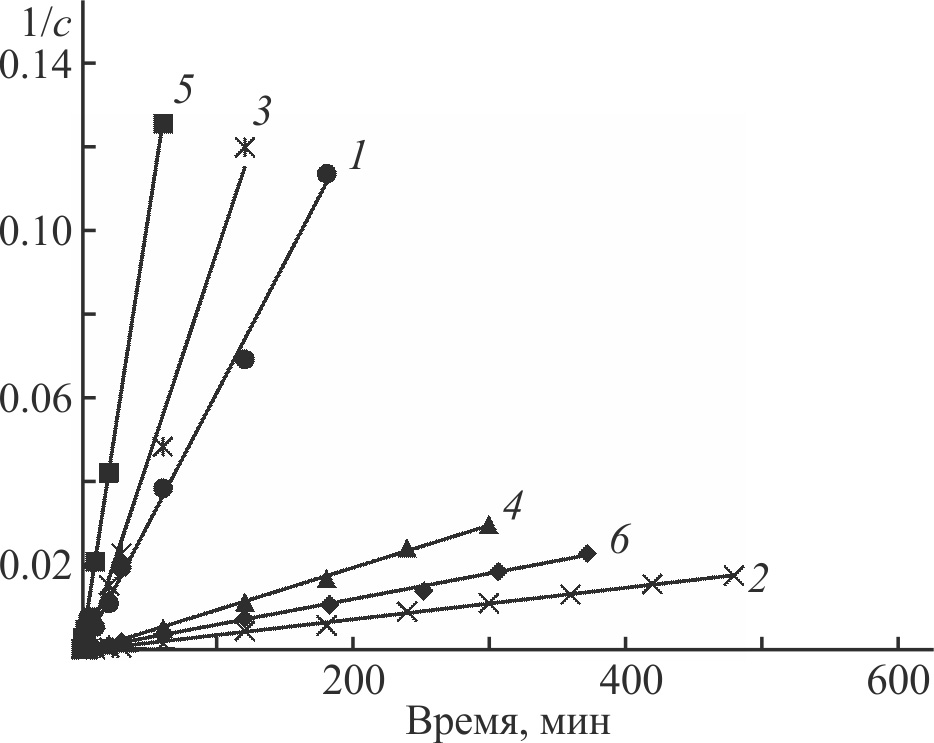 Изменения концентрации пентаэритрита во времени в различных условиях, рассчитанные по уравнению (4), описываются линейными зависимостями с коэффициентом корреляции >99% в интегральных координатах 1/с = f(τ) (рис. 1), что подтверждает принятый второй порядок реакции.