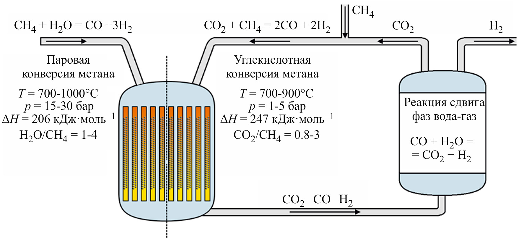 Рис. 2. Упрощенная схема получения водорода из метана при помощи паровой и углекислотной конверсии метана.