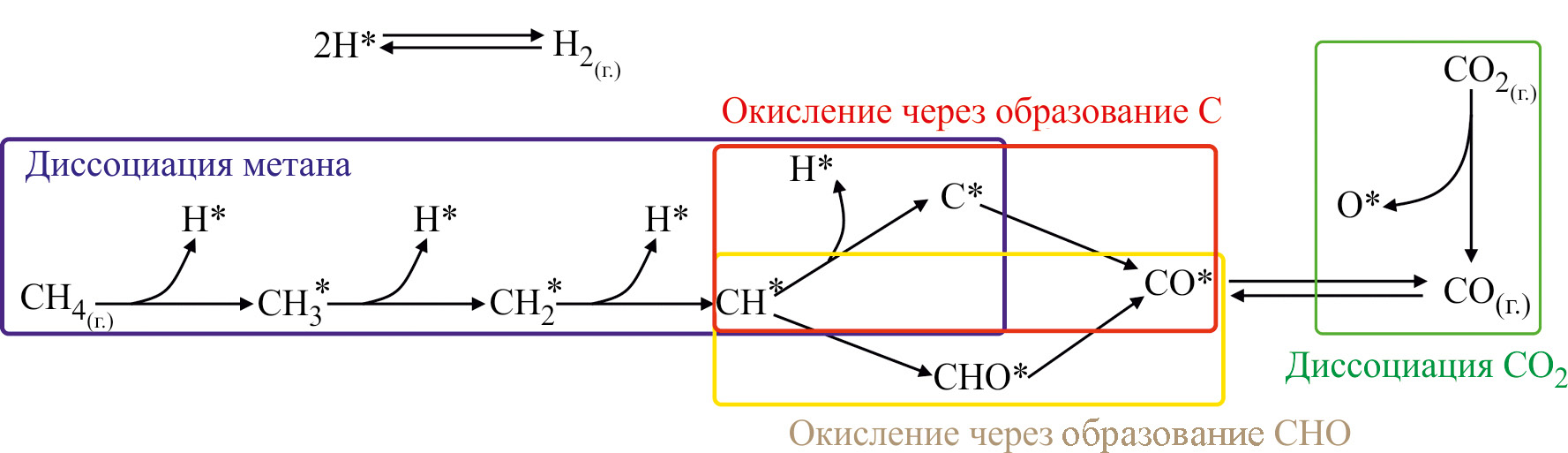 Рис. 4. Упрощенный механизм протекания процесса углекислотной конверсии метана.