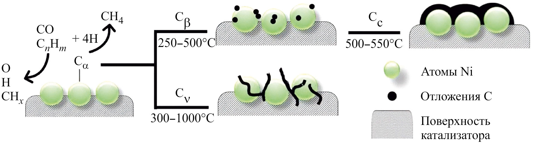 В общем случае образование углеродных отложений происходит по сложному механизму, включающему множество элементарных стадий. Однако этот углерод может быть различен по своей природе и морфологии. В зависимости от дисперсности активного металла, его типа, концентрации активных центров, природы носителя и промотора, температуры и продолжительности реакции образующийся углерод может быть карбидным, аморфным, полимерным, в виде нанотрубок или графена, графитоподобным, нитевидным [34–38]. Все эти формы углеродистых отложений различаются своей инертностью, которую можно оценить как способность восстанавливаться водородом (рис. 6): наименее инертен углерод типа Сα, который может быть восстановлен при температурах до 200°C. К такому типу углеродных образований принадлежат небольшие островки углерода на поверхности частиц металла и пленки карбидов металлов на поверхности наночастиц. Более инертны полимерный и аморфный типы углерода Сβ, для восстановления которых требуются температуры не менее 400°C. Наименее реакционноспособными считаются графитоподобный и так называемые нитевидные типы углерода Сс и Сν, крайне тяжело вступающие во взаимодействие с водородом даже при высоких температурах.