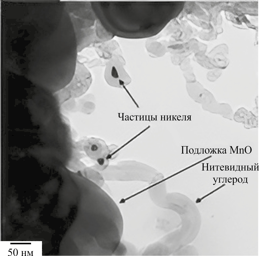 Интересно отметить влияние размера частиц на возможность формирования нитевидного углерода. Движущая сила данного процесса — градиент концентраций углерода на различных участках кристаллической структуры никеля: атомы углерода мигрируют от наиболее насыщенных участков, на которых происходит отложение углерода в ходе углекислотной конверсии метана, к наименее насыщенным участкам частицы никеля [45]. При этом внедрение в кристаллическую структуру и миграция углерода происходят до момента насыщения частицы металла углеродом [37]. Такое насыщение протекает значительно быстрее в случае маленьких частицах металла. Более того, из-за небольшого количества накопленных таким образом атомов углерода на границе металл/носитель образование точки роста нитевидного углерода не происходит. Поэтому в случае маленьких частиц никеля (менее 7–10 нм) [46–49] образование нитевидного углерода подавлено. Таким образом, комбинация высокой дисперсности металла и правильно подобранных условий проведения процесса позволят отсрочить момент образования углеродных отложений и продлить срок работы катализатора до его дезактивации.
