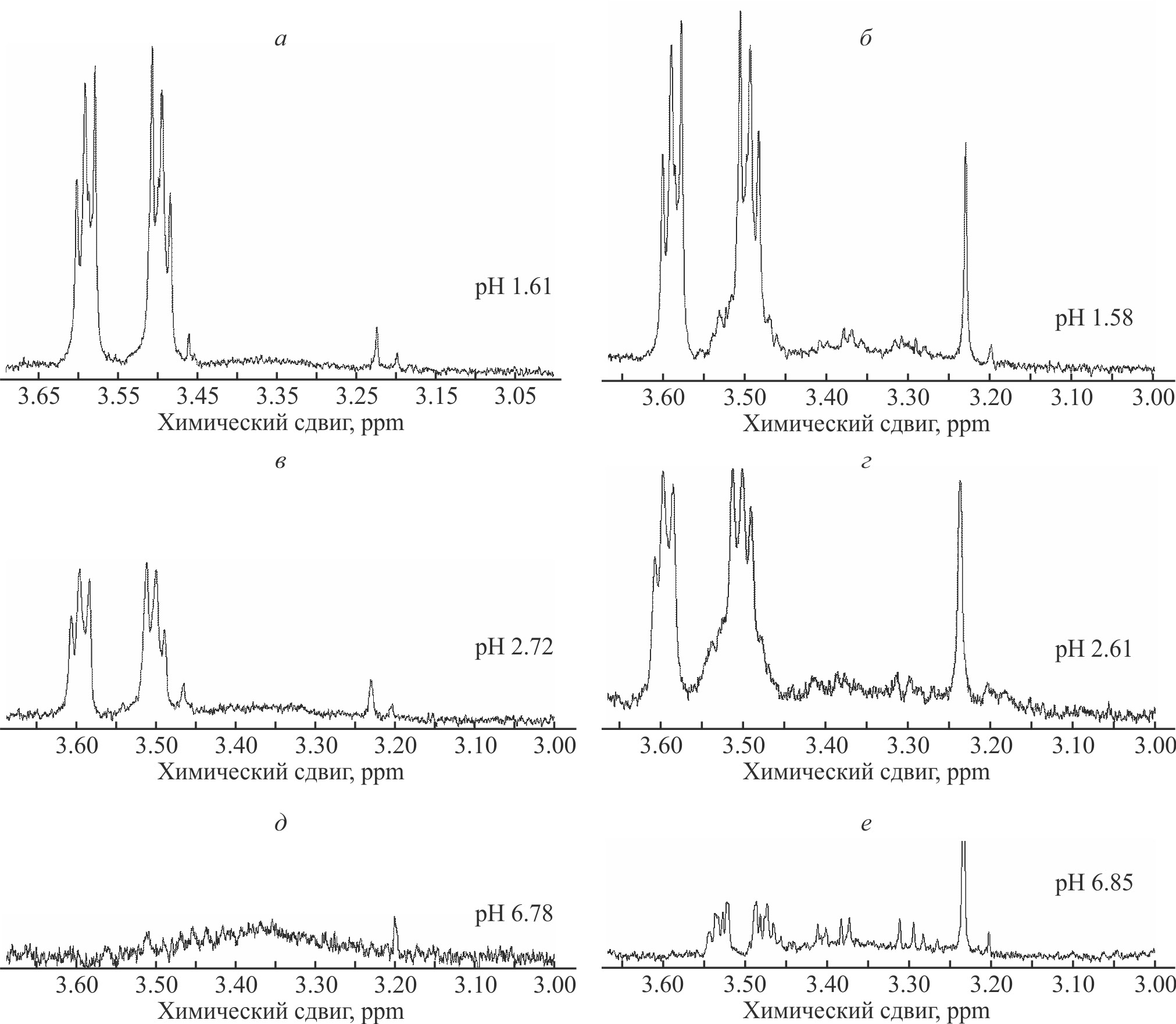 Рис. 6. Фрагменты спектров ЯМР 1H c сигналами CH2N TGDE-11sb (а) и TGDE-12sb (б) в D2O при 27°С для трех значений pH, сmax полимера в образцах 0.44 и 0.35 мМ соответственно.