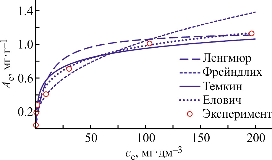 По результатам исследований можно сделать вывод, что прокаленный сорбент характеризуется мономолекулярной адсорбцией. Удовлетворительное описание зависимости Ae = f(ce) получено по двухпараметрическим изотермам Темкина и Еловича и трехпараметрическим Редлиха–Петерсона и Ленгмюра–Фрейндлиха.