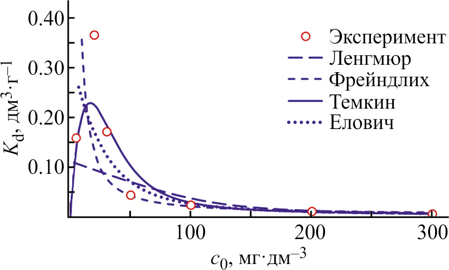 Авторами предпочтение отдано изотерме Темкина, качественно верно прогнозирующей зависимость коэффициента распределения Kd и эффективность извлечения E ионов аммония из раствора от начальной концентрации ионов аммония c0 в растворе.