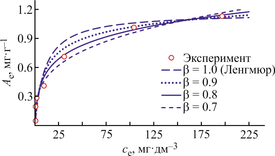 Линейные зависимости построены в координатах /Ae = f() при изменении параметра β от 0.5 до 1.0. Параметры изотермы Ленгмюра–Фрейндлиха приведены в табл. 6. При β = 1.0 уравнение (15) переходит в уравнение Ленгмюра.