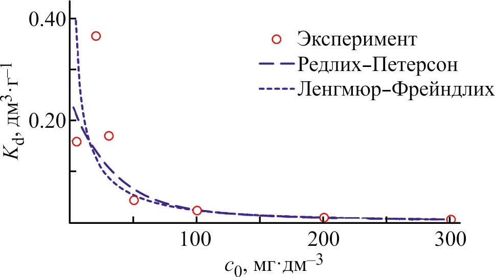 Для обеих изотерм аналогично проведен расчет коэффициента распределения Kd: при β = 0.8 для изотермы Редлиха–Петерсона и при β = 0.6 для изотермы Ленгмюра–Фрейндлиха (рис. 5). В области малых концентраций ионов аммония от 0 до 30 мг·дм–3 функция Kd = f(c0) является монотонно убывающей и не имеет экстремума для обеих трехпараметрических изотерм адсорбции, что не отвечает экспериментальным данным.