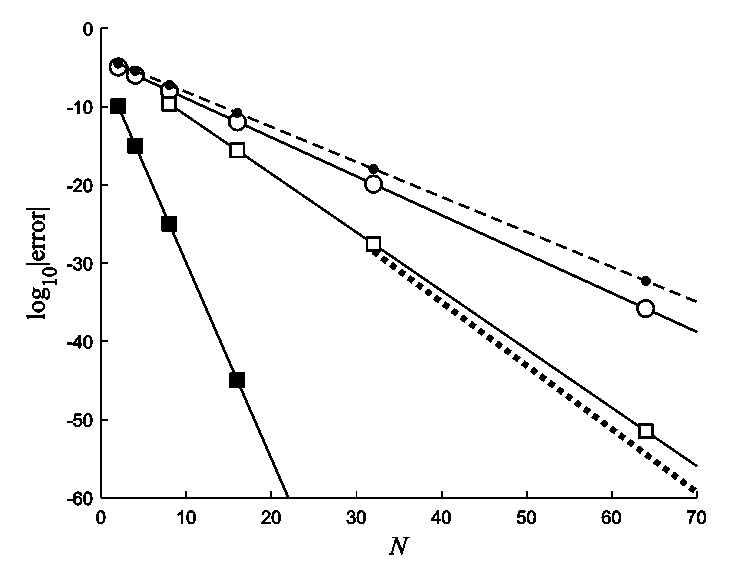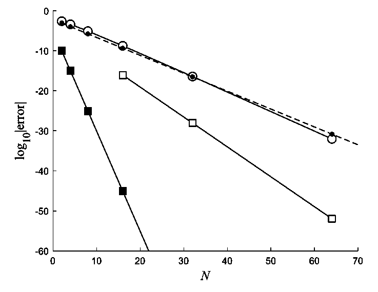 Светлыми квадратами показана погрешность квадратуры (10) после апостериорной экстраполяции (29). Видно, что по точности она кардинально превосходит исходную квадратуру трапеций. В пределах графика выигрыш составляет от до раз. При дальнейшем увеличении N преимущество еще увеличивается. Погрешность порядка ошибок округления двойной точности достигается уже при