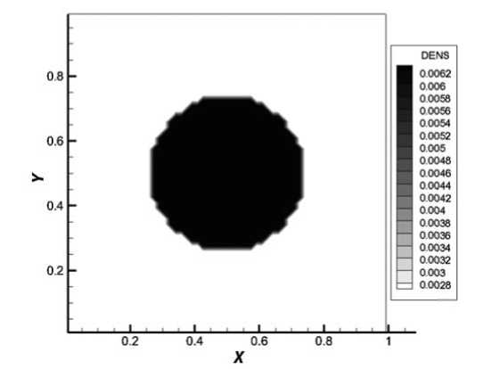 На фиг. 4–7 представлены результаты расчетов плотности и магнитных полей в момент времени 0.05 мкс. На фиг. 4 изображено распределение плотности, на котором можно увидеть, что под воздействием магнитных полей происходит сжатие плотности к центру расчетной области.