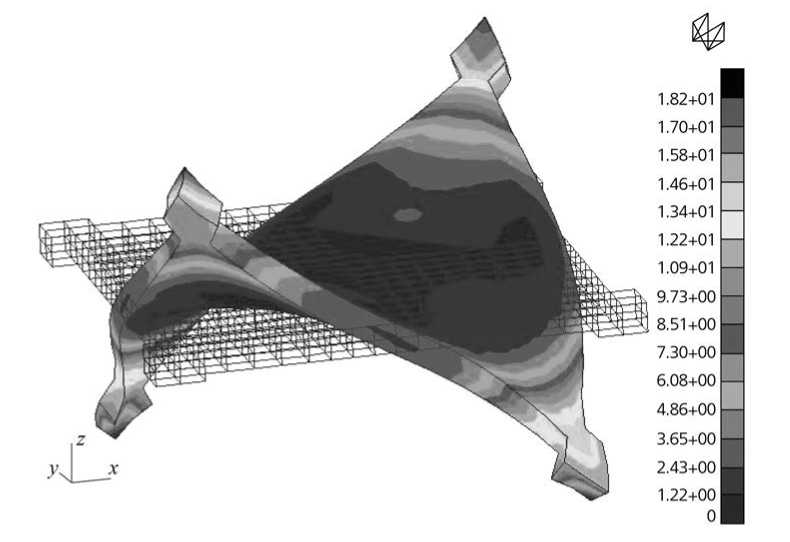 Решение задачи оптимизации траекторий деформирования рассматривается на примере формообразования квадратной пластинки с выступами толщиной 12 мм и длиной стороны 180 мм. Выступы необходимы для расчета остаточной формы пластинки с двойной кривизной (см. [20]). Таким образом, находится прогиб пластинки, моделирующий кручение (см. [20]) в виде узловых перемещений по координате, нормальной к поверхности пластинки (значения максимальных перемещений в углах — 80 мм). Данная величина прогиба выбрана с целью уменьшения сопротивления пластинки изгибу и сведения задачи к нахождению прогиба гибкой мембраны (см. [16]). Для более полного анализа рассматривается объемная постановка задачи (фиг. 1) c 8-узловыми изопараметрическими шестигранными конечными элементами с трилинейной аппроксимацией функций. При вычислениях в системе MSC.Marc подключаются дополнительные параметры, улучшающие характеристики сдвига (или изгиба) и описывающие несжимаемое поведение материала путем использования альтернативной функции интерполяции и альтернативной процедуры интегрирования (см. [21]). Количество элементов в модели определено в соответствии с проведенным ранее анализом (см. [20]) и обеспечивает достаточную точность при относительно небольшом времени расчета.