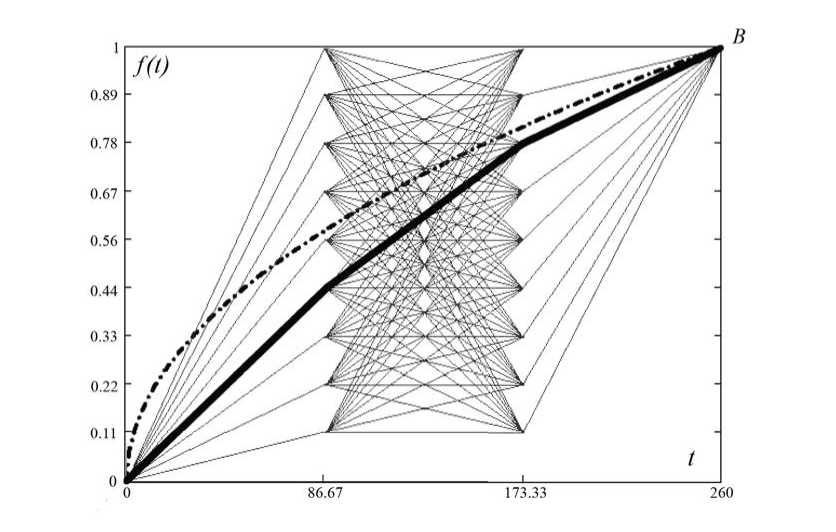 Численное решение задачи оптимизации траектории деформирования сводится к перебору вариантов при каждом параметре tk. Набор вариантов функции f(t) задается ломаными линиями, проходящими от точки O к точке B (фиг. 2). В результате оптимальное решение, полученное методом динамического программирования при N=3, M=9, N=4, M=12 и N=6, M=18 (фиг. 2–4), приближается к аналитической кривой и не совпадает с линейной функцией (жирная кривая — численные результаты, штрихпунктирная кривая — аналитические данные для больших прогибов пластины, см. [6; 12]). Вычисленное максимальное значение работы рассеяния в пластинке по аналитической траектории в случае больших прогибов оказывается меньшим по сравнению со всеми возможными траекториями, определенными методом динамического программирования.