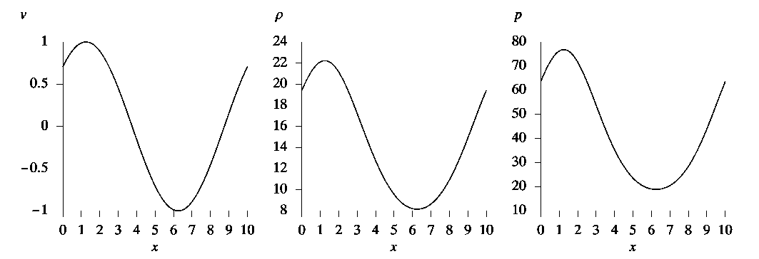 Ясно, что начальные данные (3) представляют собой периодическое гладкое изоэнтропическое течение. С течением времени решение задачи (1), (3) ведет себя как опрокидывающаяся прогрессивная волна. Она движется слева направо (по оси x); те ее участки, где градиенты параметров газа положительны, растягиваются, а те участки, где эти градиенты отрицательны, напротив, сокращаются. Приблизительно в момент времени t = 1.3 происходит градиентная катастрофа и формируются периодические ударные волны, которые затем распространяются с числом Маха, колеблющимся в диапазоне от 1.2 до 1.4. Каждая из ударных волн имеет область влияния, которая примыкает к фронту слева и расширяется.