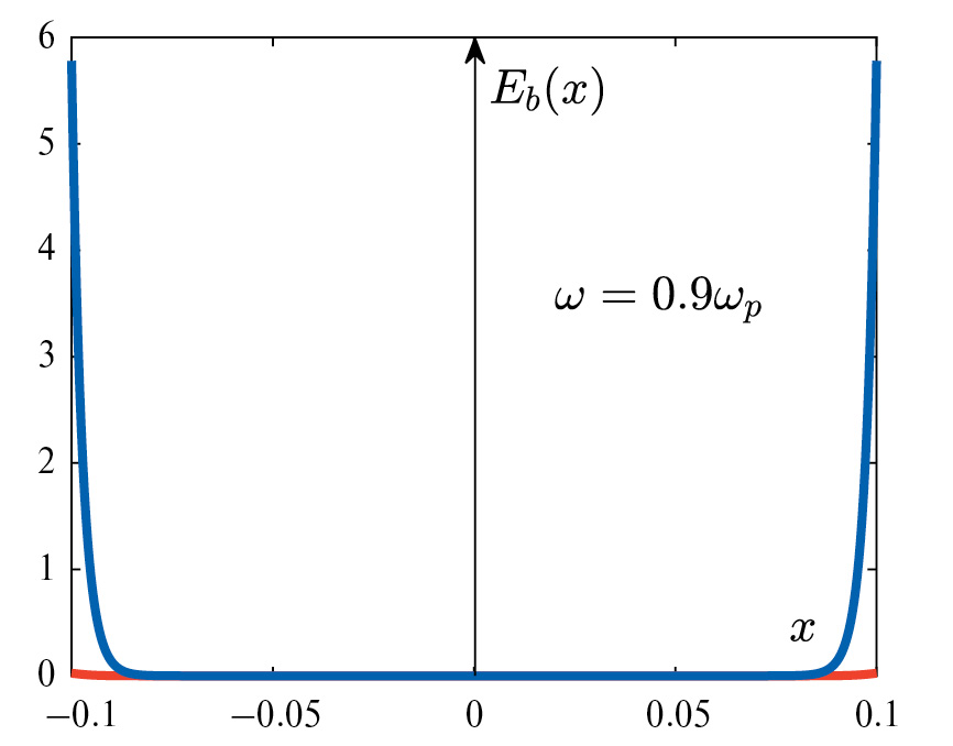 Фиг. 3. Величина Eb(x) в зависимости от координаты x при ω = 0.9ωp, ν / ωp = 0.001, синим – вещественная часть, красным – мнимая.