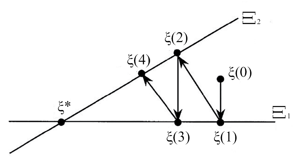 Дальнейшее обобщение результатов Ерёмина и Брэгмана было получено в работе Л. Г. Гурина6, Б. Т. Поляка и Э. В. Райка [15]. Как и в работе [14], исследовались два типа алгоритма попеременных проекций (в циклическом порядке и на самое дальнее множество) для замкнутых выпуклых множеств в произвольном гильбертовом пространстве. Были получены условия экспоненциальной (в норме гильбертова пространства) сходимости обоих алгоритмов в случае, если каждое из множеств Ξi имеет непустое пересечение с внутренностями остальных множеств:
