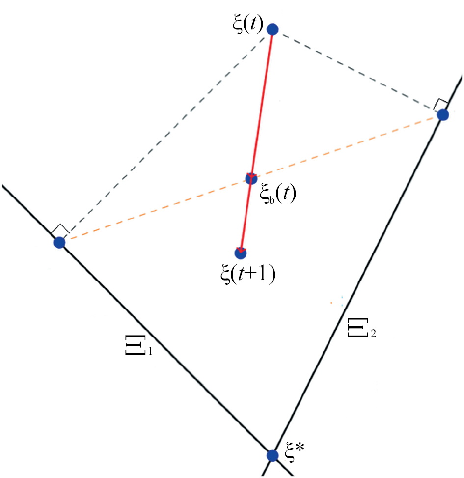 2.2.2. Алгоритм Чиммино. Итеративный алгоритм Чиммино, предложенный в [11], в определенном смысле является прообразом распределенных многоагентных алгоритмов, рассматриваемых в разд. 3. Его отличием от алгоритма Качмаржа является то, что на итерации ξ(t) проектируется одновременно на все гиперплоскости. Затем вычисляется центр масс полученных проекций ξb(t), который может быть выбран в качестве следующего приближения ξ(t + 1). Более общо, следующее приближение может быть получено как