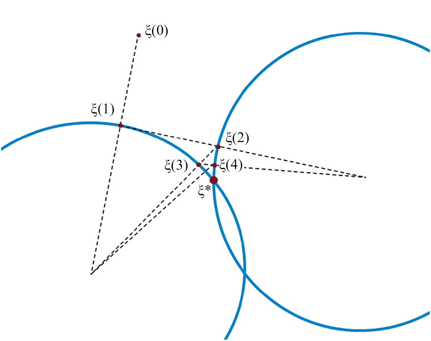 Большинство имеющихся в литературе алгоритмов для вычисления общей точки выпуклых множеств являются модификациями и обобщениями метода поочередных (alternating) проекций. В англоязычной литературе для данного метода также используется аббревиатура POCS (projection onto convex sets, т. е. проекции на выпуклые множества). История данного метода восходит к работам Качмаржа [10] и Чиммино [11] по релаксационным методам решения систем линейных уравнений, а впервые (в специальном случае двух линейных подпространств) он, по-видимому, упомянут в лекциях фон Неймана по геометрии гильбертова пространства, изданных в виде монографии [12]. Разработанная впоследствии теория метода поочередных проекций, во многом базируется на работах трех крупнейших специалистов в области оптимизации и численных методов: И. И. Ерёмина, Б. Т. Поляка и Л. М. Брэгмана, чьи пионерские работы [13]–[15] появились практически одновременно. Исследование последовательных итеративных проекций привело, с одной стороны, к развитию теории фейеровских процессов (см. [16]–[19]), а с другой стороны, послужило мотивацией для изучения D-расстояния (дивергенции) Брэгмана (см. [20]), в настоящее время играющего исключительно важную роль в задачах машинного обучения, оптимизации и вычислительной геометрии.