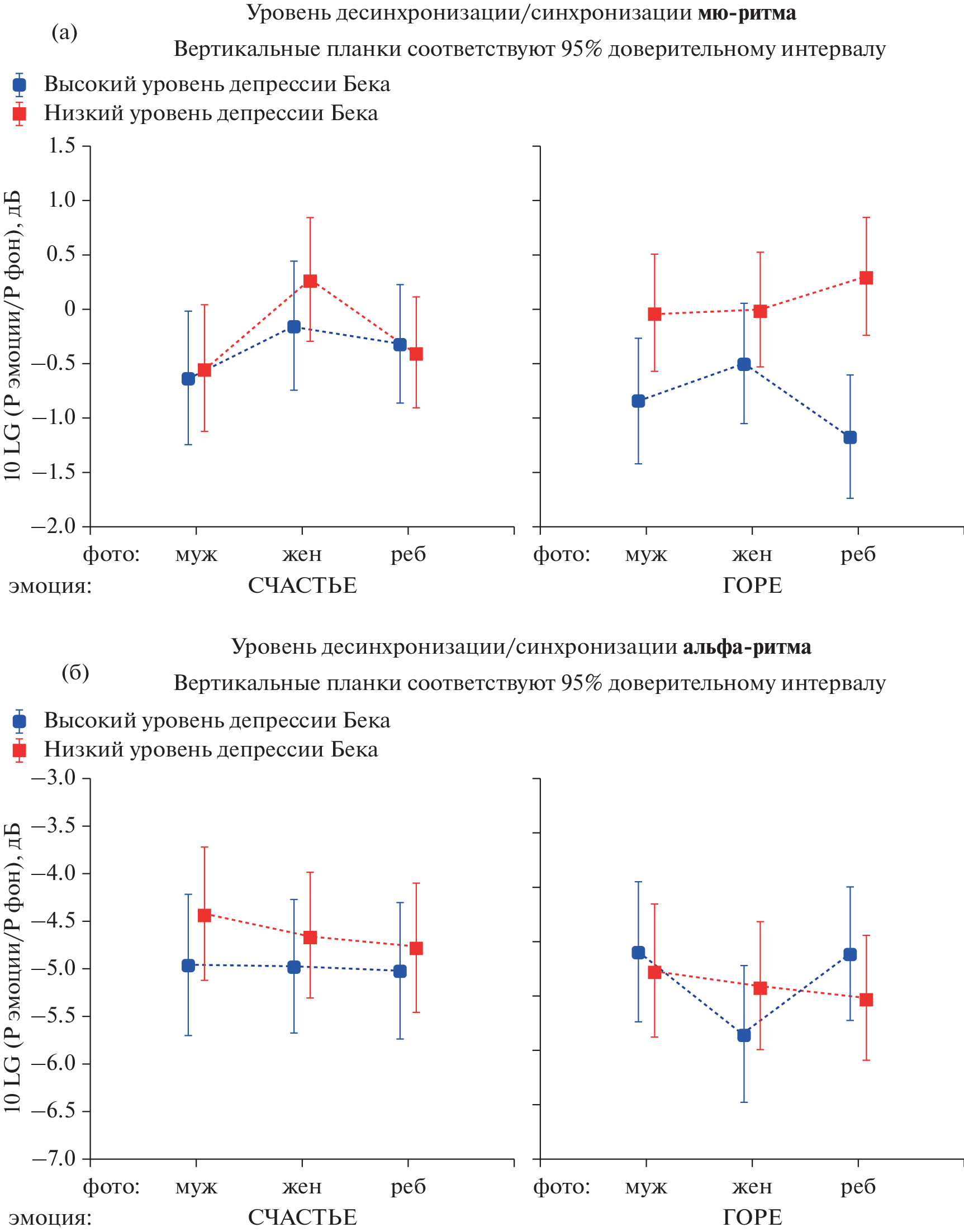 Мировые события последних нескольких лет привели к тому, что все больше людей начинают испытывать депрессивные симптомы, которые в значительной степени влияют на эмоциональный фон человека и его восприятие окружающего мира. Целью данного исследования было проанализировать реакции мю- и альфа-ритмов, отражающих работу зеркальной и зрительной систем головного мозга, при восприятии и повторении эмоционально окрашенных социальных стимулов у людей с разным уровнем депрессии. В исследовании приняли участие 32 здоровых испытуемых, которые были разделены на две группы – с высоким и низким уровнем депрессии по шкале Бека. Регистрировали 32-канальную ЭЭГ в двух экспериментальных блоках, активирующих эмоциональную и моторную составляющие зеркальной системы мозга (ЗСМ): 1) при восприятии эмоциональных лиц, выражающих счастье или горе; 2) при наблюдении и повторении моторных жестов рукой. Анализировали степень десинхронизации компонент мю- и альфа-ритма, выделенных методом независимых компонент (ICA), в каждой из задач. Было получено, что десинхронизация мю-ритма была достоверно выше у людей с высоким уровнем депрессии при повторении моторных движений рукой, а также при восприятии негативной эмоциональной мимики. Десинхронизация альфа-ритма не отличалась у двух групп испытуемых. Таким образом, развитие депрессивного состояния усиливает активацию ЗСМ, при этом повышается ее чувствительность к негативным эмоциональным стимулам. Данный эффект не распространяется на зрительную кору и визуальное внимание.