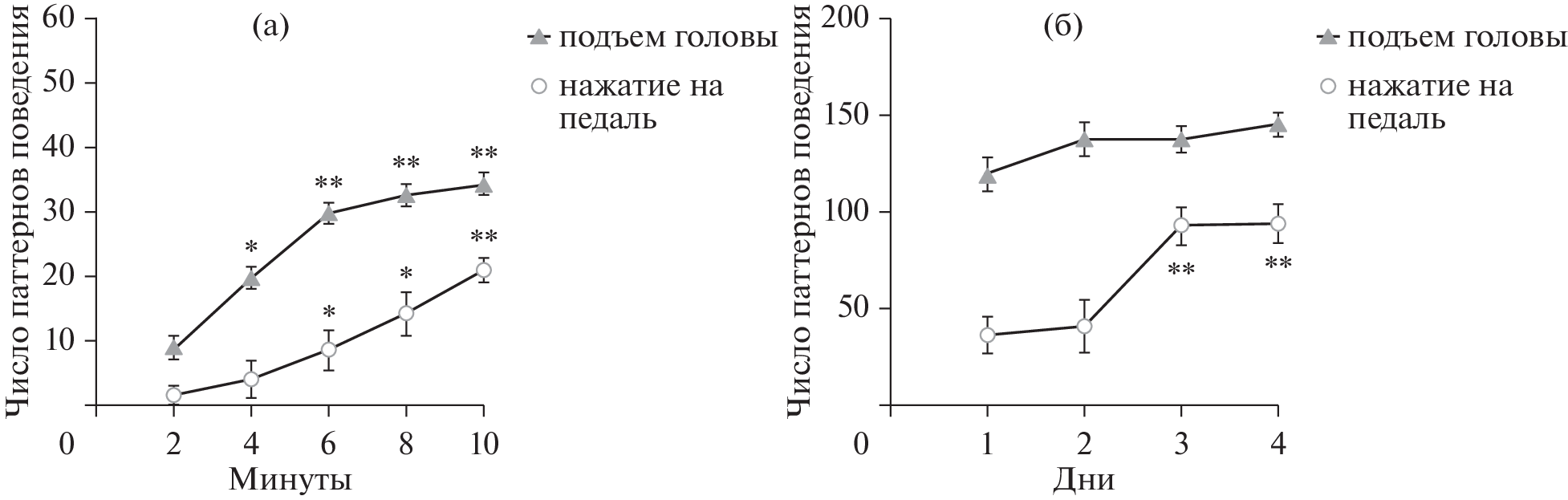 In this work, we propose a method for training rats electrical self-stimulation in response to rearing head in a telemetric system that records the level of extracellular dopamine. Initially, in the experiments of J. Olds, it was shown that in response to electrical stimulation of zones of positive reinforcement, rats exhibit natural exploratory behavior aimed at finding the source of the reward. It has been suggested that a natural behavioral act, in particular rearing head, can accelerate the development and stabilization of the self-stimulation reaction. A change in the position of the head can serve as an internal proprioceptive conditioned signal. The experiments were carried out in an annular chamber, where the ventral tegmental area (VTA) was stimulated using a telemetric system when the rat’s head was raised by 38°. The self-stimulation response to rearing head was developed and stabilized during the first day of training. With pedal self-stimulation, distinct repetitive reactions were observed only on the 3rd day of training after the procedures of “pushing” on the pedal on the 1st day of training and “repulsing” from the pedal on the 2nd day of training, stabilization of the reaction was observed only by the 4th day training. After stabilization of the self-stimulation response in rats, the level of extracellular dopamine in the nucleus accumbens was recorded by fast-scan cyclic voltammetry in response to the imposed stimulation of the VTA before and after each of the three series of self-stimulation lasting 10 minutes. After each series of self-stimulation, the level of extracellular dopamine decreased, which reflects the depletion of the intracellular pool of the neurotransmitter during prolonged self-stimulation of the VTA. The conclusion is made about the prospects of using the method of training rats to electrical self-stimulation in response to rearing head to study the mechanisms of reinforcement.
