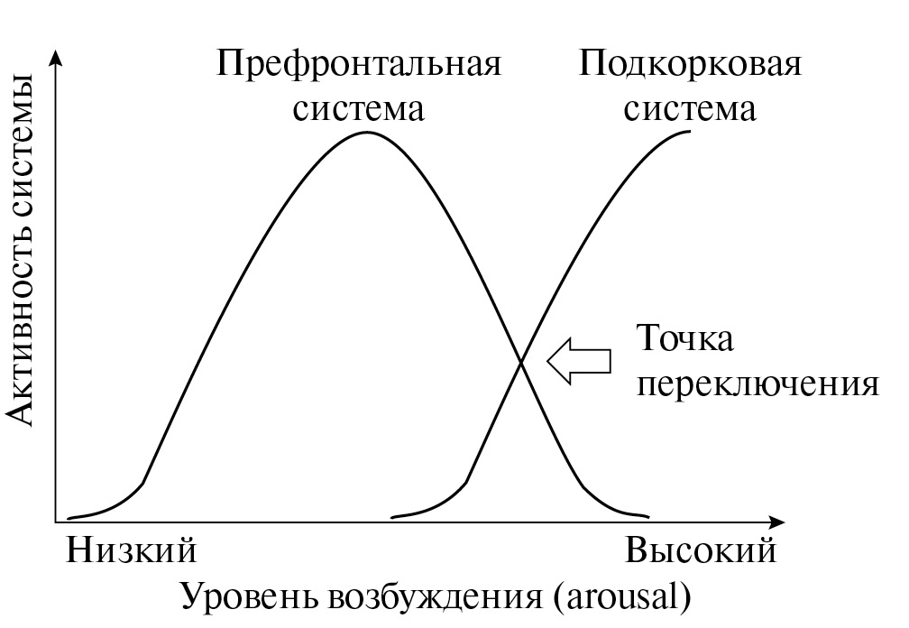 Возможность высокоуровневой регуляции поведения с задействованием нейросети ментализации зависит от уровня физиологического возбуждения (arousal). L. Mayes сформулировала концепцию двух систем регуляции уровня возбуждения (рис. 3) (Mayes, 2000). На низком и умеренном уровне возбуждения в регуляции социального поведения доминирует префронтальная система, ассоциированная с произвольной саморегуляцией на основании процессов ментализации. По мере повышения уровня возбуждения активность префронтальной системы убывает и одновременно нарастает активность непроизвольной подкорковой регуляторной системы, связанной с базовыми автоматическими реакциями по типу «бей или беги». Как видно на рис. 3, зависимость активности каждой из двух систем от уровня возбуждения имеет форму купола, что соответствует универсальному закону Йеркса – Додсона, в соответствии с которым существует оптимум уровня возбуждения для выполнения разных задач (Yerkes, Dodson, 1908). При этом типично, что для более простых, автоматизированных задач оптимум возбуждения является меньшим, по сравнению с более комплексными и произвольными задачами.