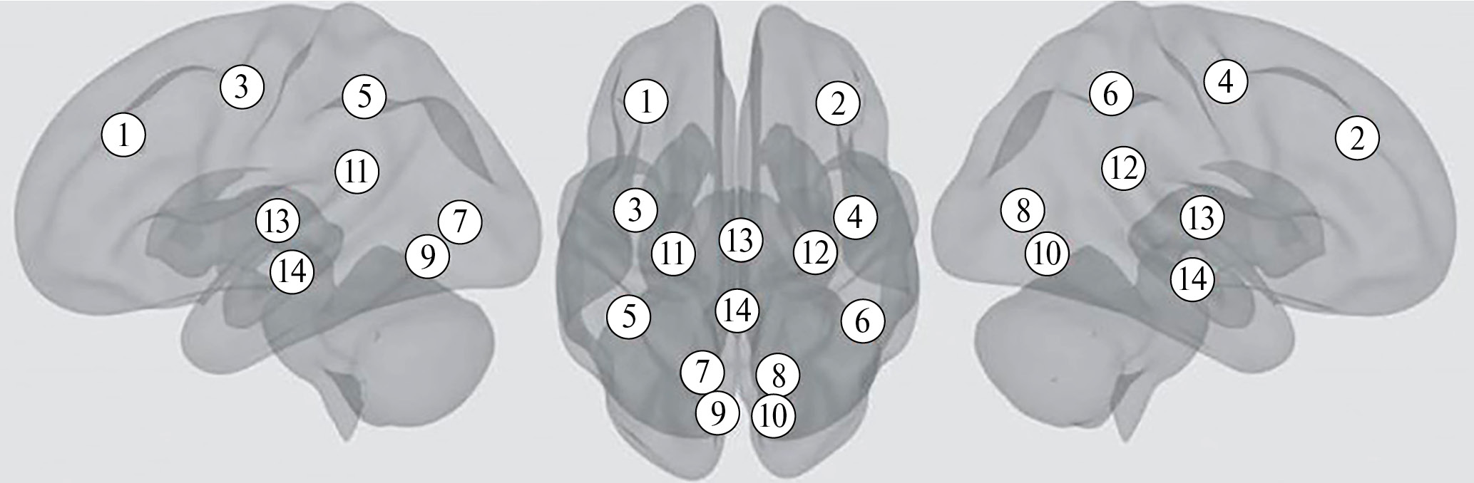 Рис. 1. «Маска» для оценки коннективности фМРТ состояния покоя. «Зоны интереса», согласно координатам атласа AAL: 1 – Middle frontal gyrus_L; 2 – Middle frontal gyrus_R; 3 – Precentral gyrus_L; 4 – Precentral gyrus_R; 5 – Inferior parietal gyrus_L; 6 – Inferior parietal gyrus_R; 7 – Lingual gyrus_L; 8 – Lingual gyrus_R; 9 – Calcarine fissure_L; 10 – Calcarine fissure_R; 11 – Hippocampus_L; 12 – Hippocampus_R; 13 – Thalamus_LR; 14 – Cingulate gyrus_LR.